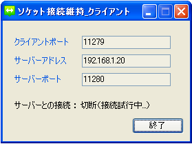 クライアント用のパソコンで「ソケット接続維持_クライアント.exe」を実行します。以下のような画面が表示されます。