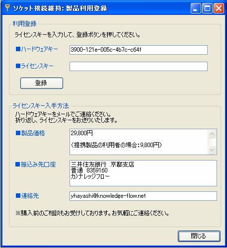 あなたの製品のホームページで「ソケット接続維持」をご紹介くださった場合、その製品の利用者には、「ソケット接続維持」を9,800円でご提供します。